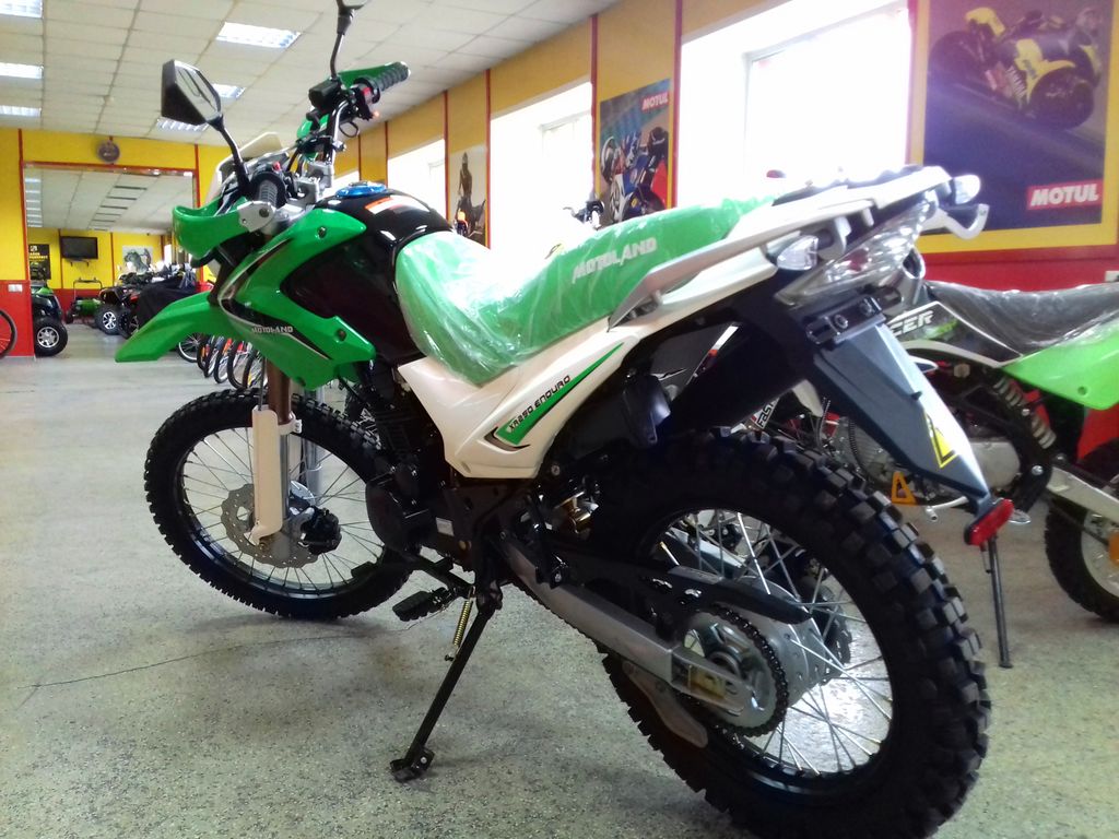 Оснащён 4-тактным двигателем мощностью 16,3 л. с. и объёмом 250 кубов, который разгоняет мотоцикл до 140 км/ч. Эндуро MotoLand отличаются высокой проходимостью, отлично ведут себя на мягком грунте и песке, легко преодолевают препятствия. Спортивный характер Эндуро 250 подчёркивается современным дизайном. Классическая конструкция акцентирует внимание на сильных сторонах мотоцикла, которому не страшны грязь, брёвна, камни и другие преграды. Мотоцикл Эндуро 250 доступен в красном, зелёном или сером цвете на выбор. Мотолэнд Эндуро весит 135 кг. Длина мотоцикла — 2100 мм, высота по седлу — 890 мм. Эндуро подходит для пользователей любого роста, хорошо держит баланс и позволяет уверенно сохранять равновесие даже на сложных участках эндуро трасс. Колёса спицованные, сделаны из алюминия. Размер переднего колеса — 21 дюйм (530 мм), заднего — 18 дюймов (450 мм). Передние и задние тормоза дисковые.